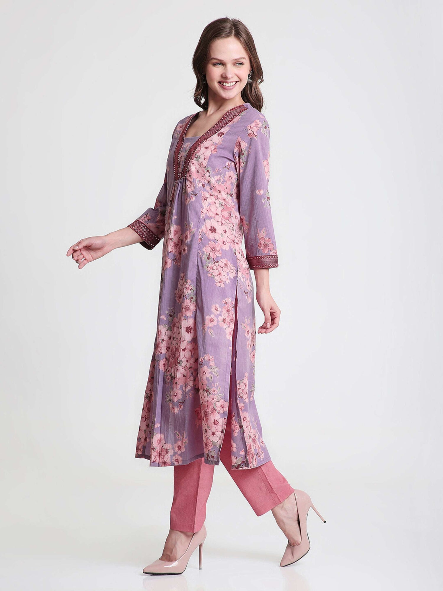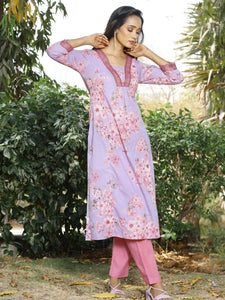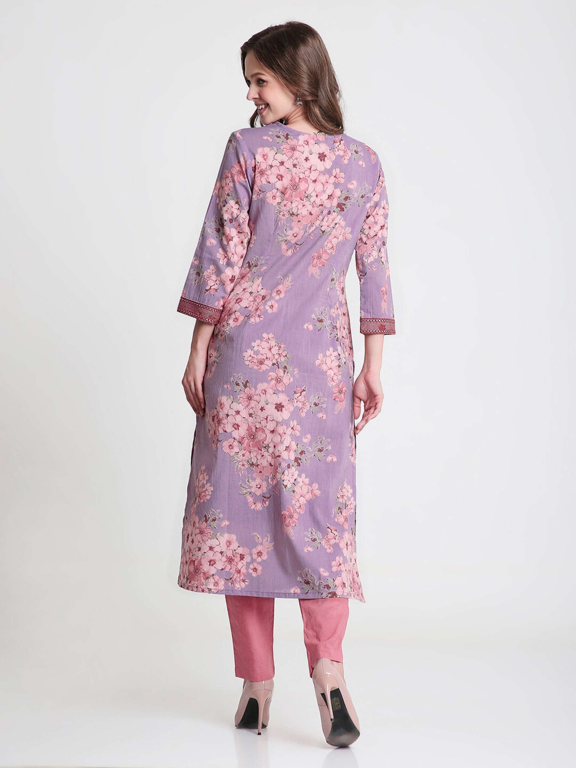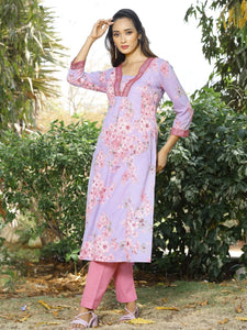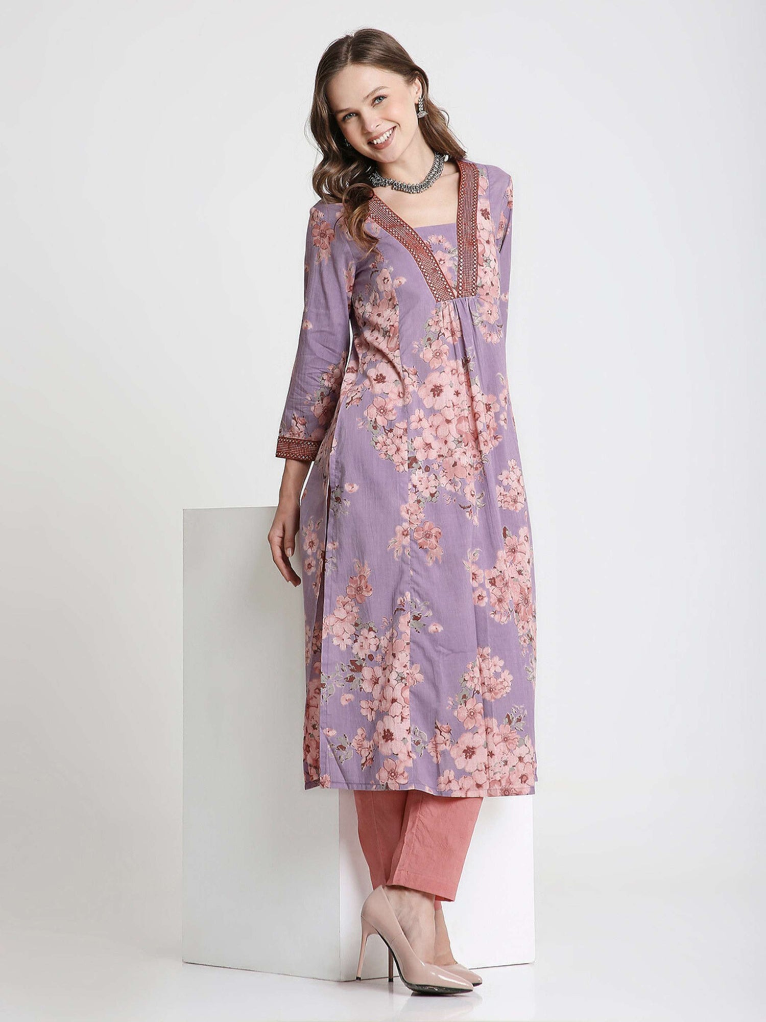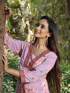 Lavender Cotton V-Neck Floral Print Kurta with Neck & Sleeve Embroidery