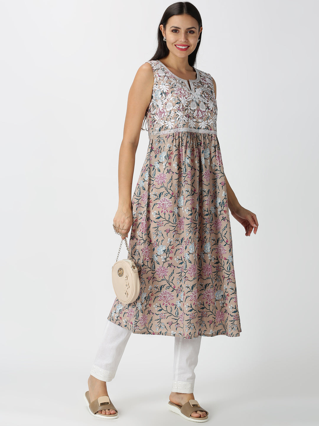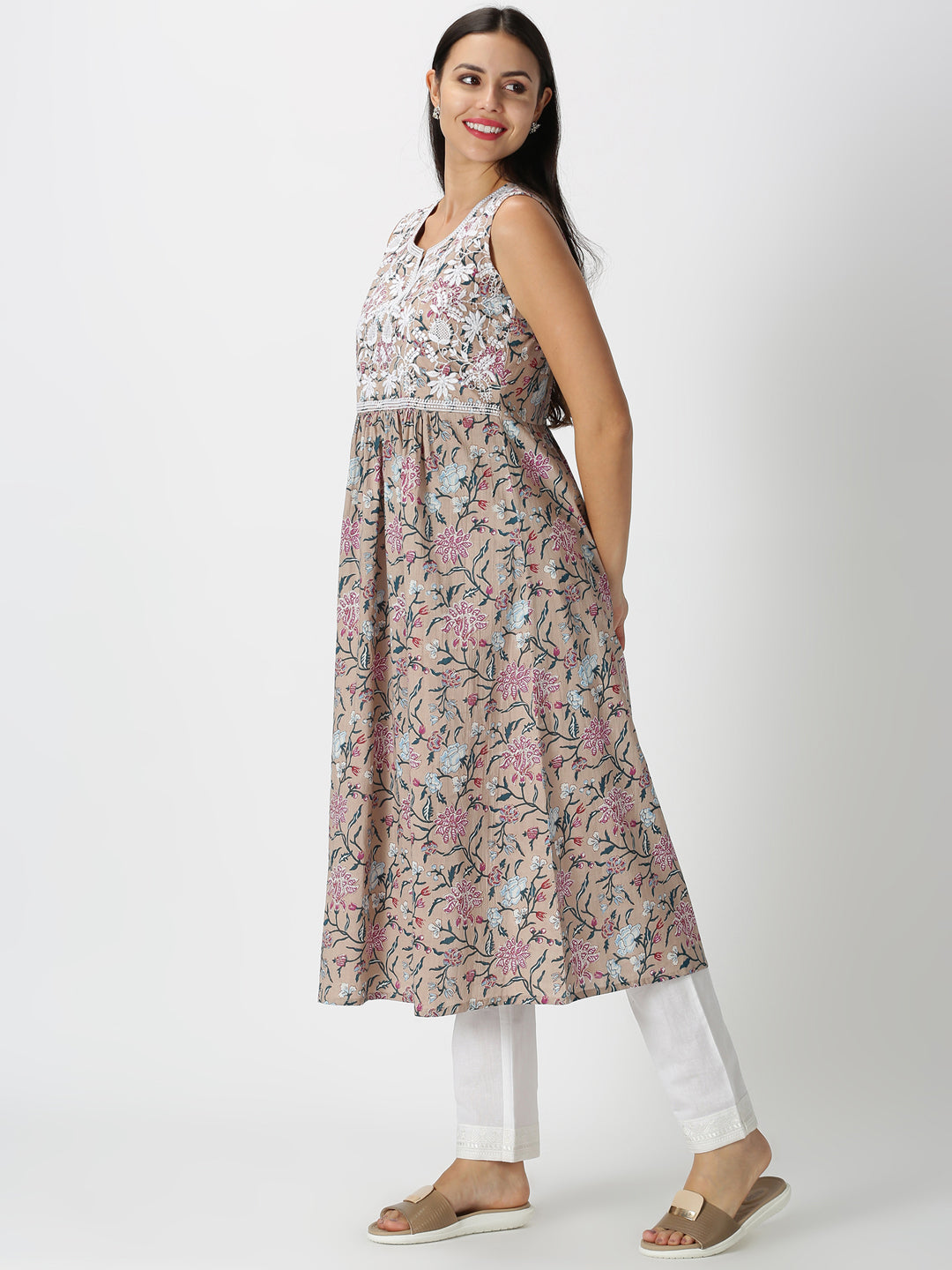 Coral Floral Print A-line Kurta with Lucknowi Chikankari Embroidery -