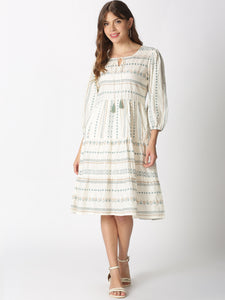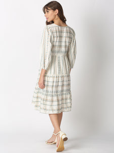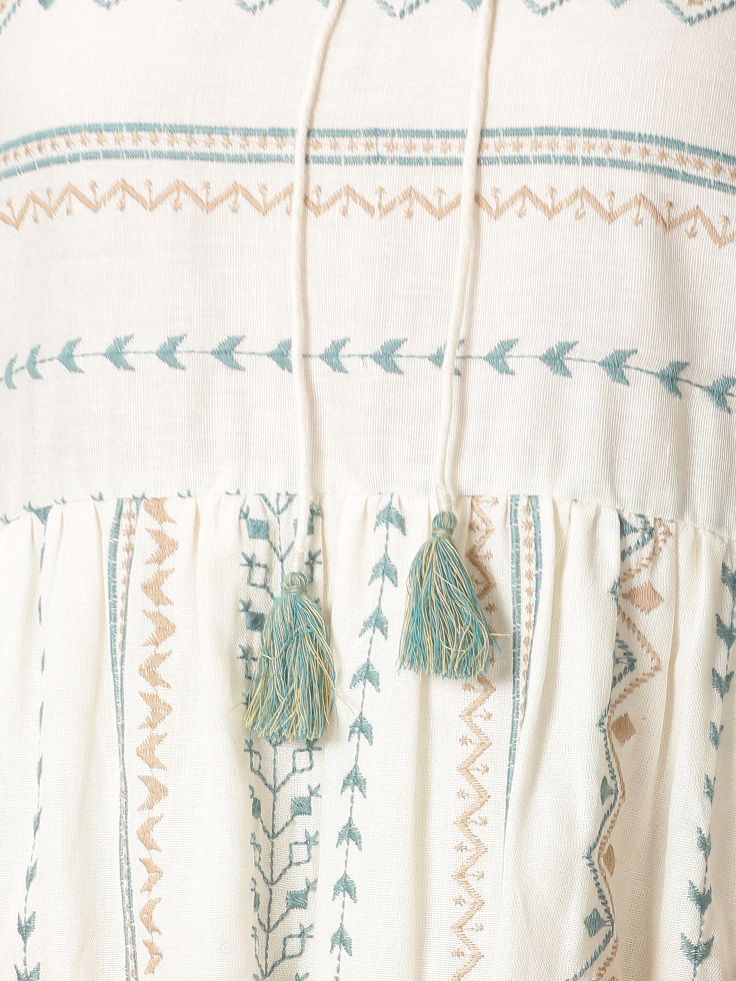 Off White-Blue Cotton Flax Bohemian Embroidered Tiered Dress with Neck Tie-up