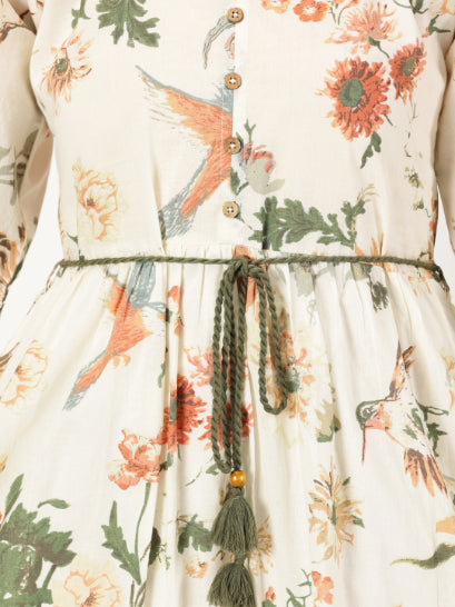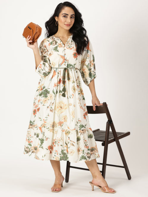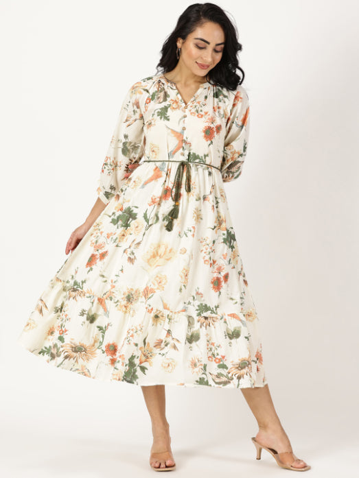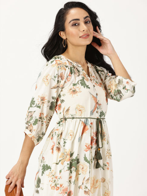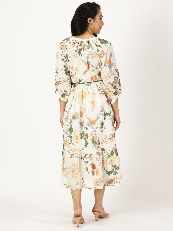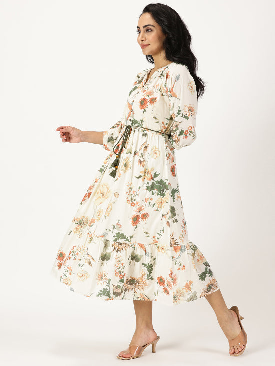Yellow Floral Printed Midi Dress with Waist Tie-up -