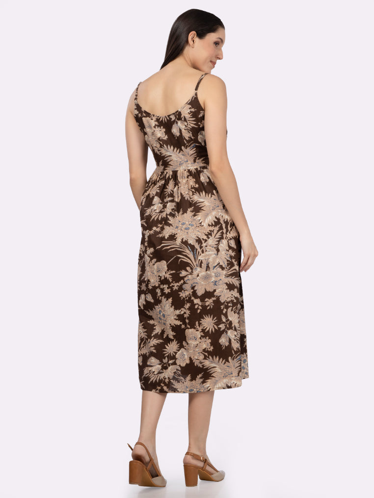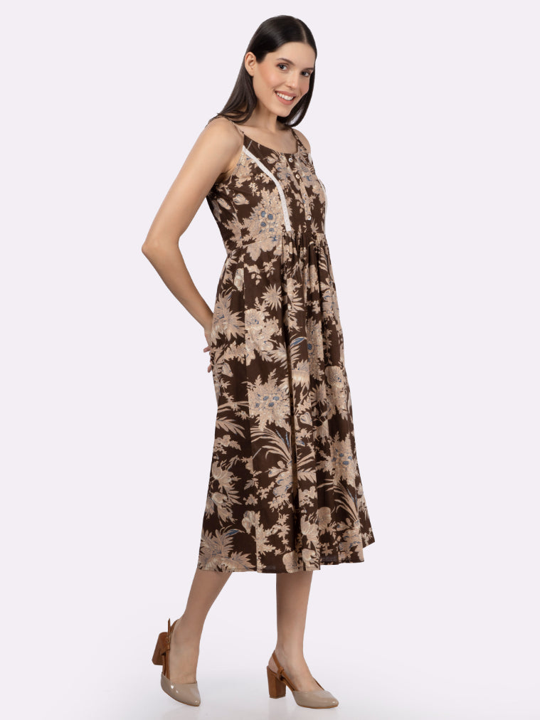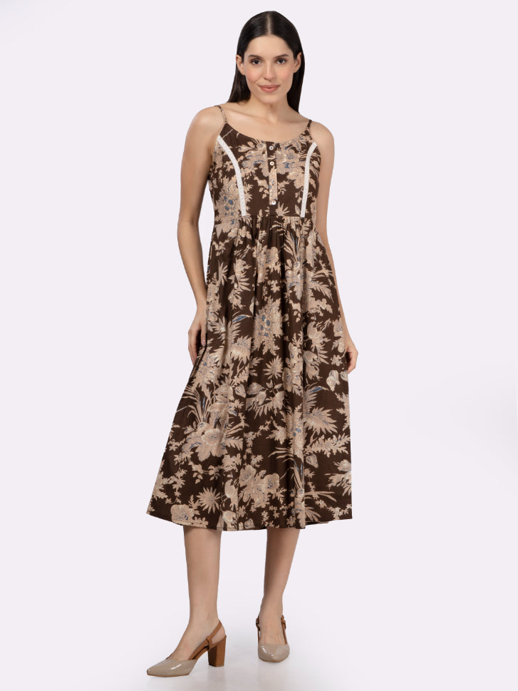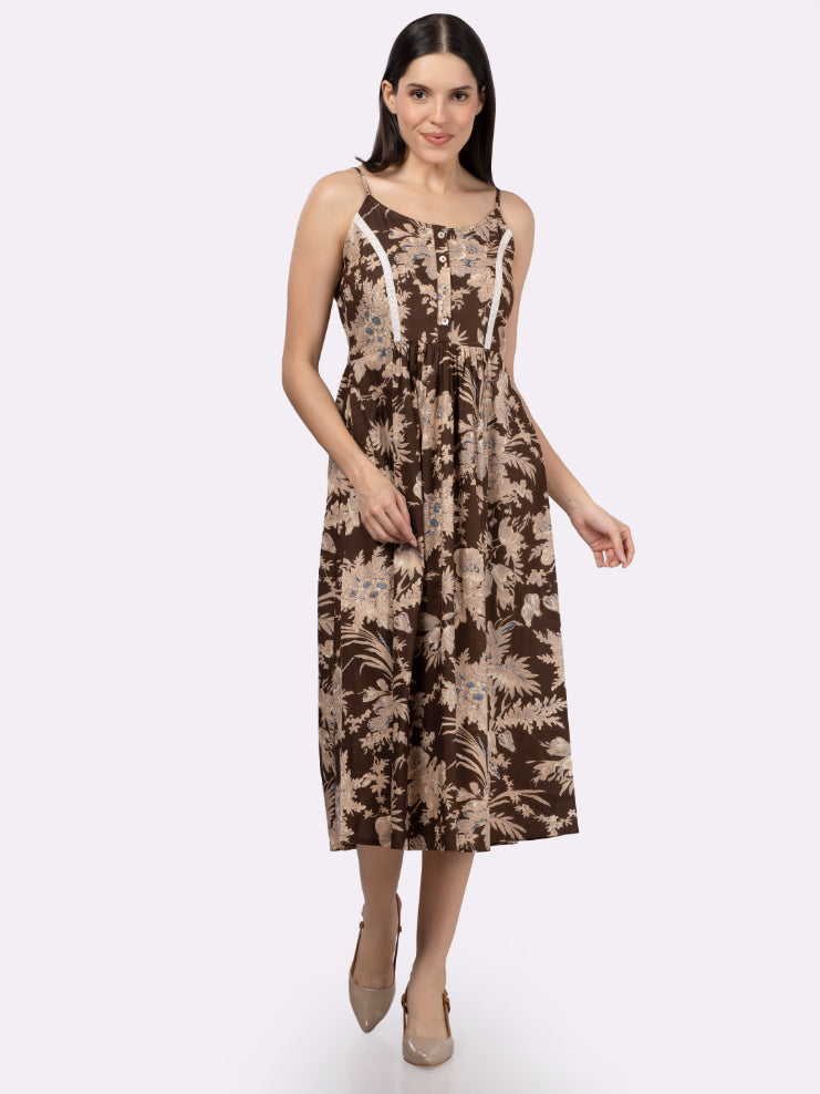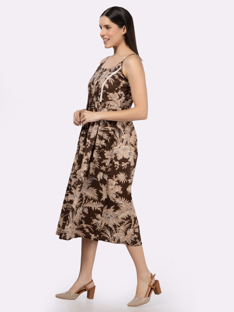 Brown Floral Print Strappy Dress with Lace Inserts -