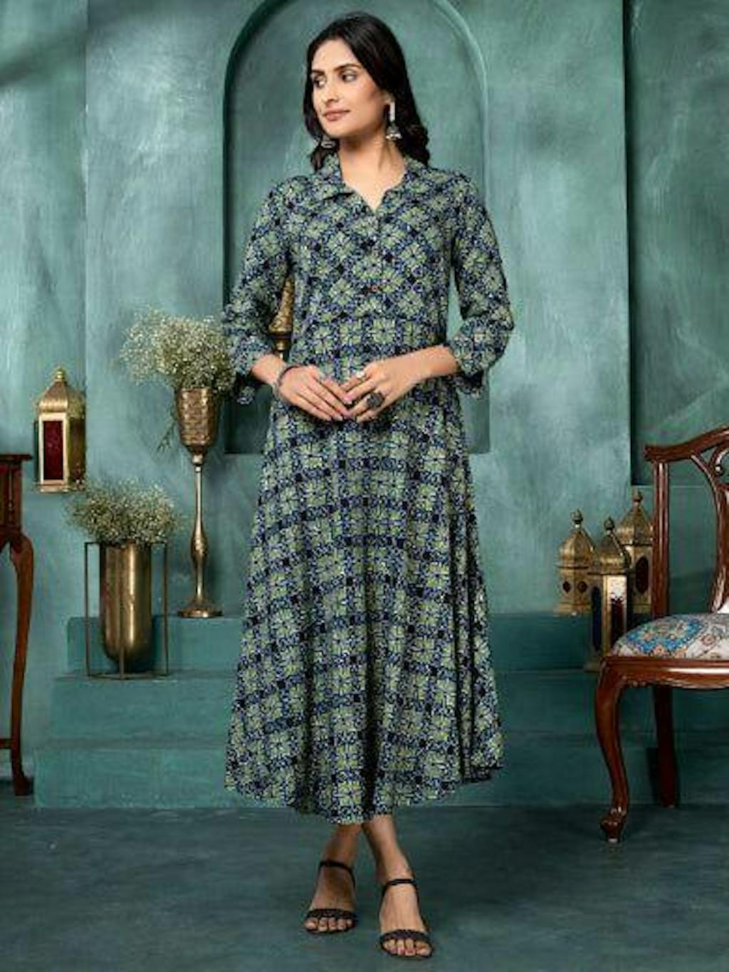 Blue-Green Floral Grid Shirt Collar Midi Dress
